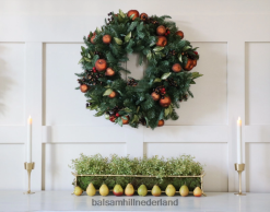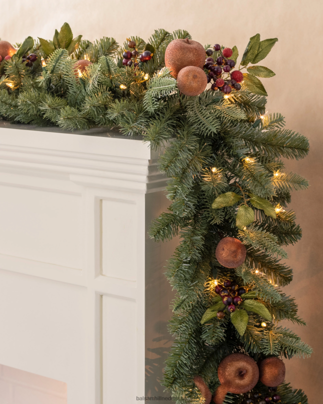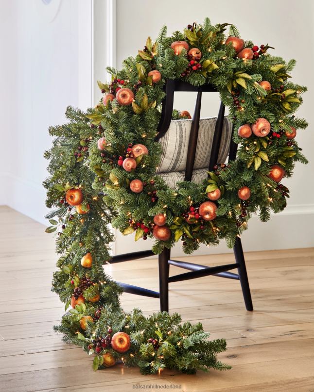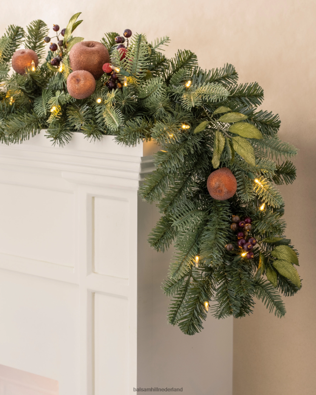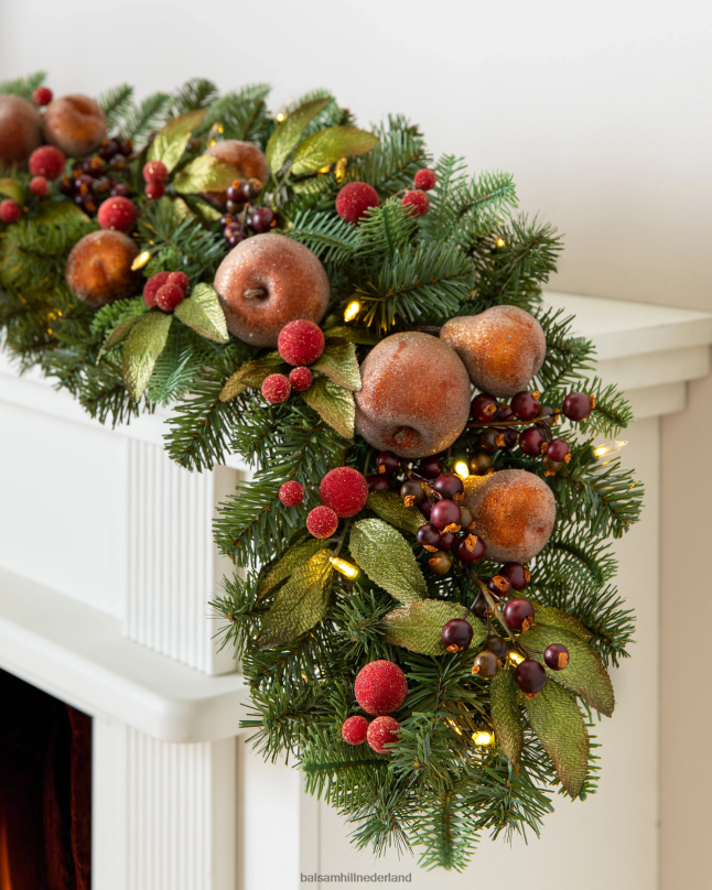 Vier de feestdagen met de natuurlijke elegantie van deze bladcollectie. weelderige balsemsparnaalden, rijkelijk versierd met nepfruit en bessen, geven elke ruimte een gezellige, rustieke uitstraling.