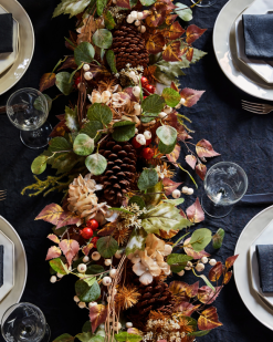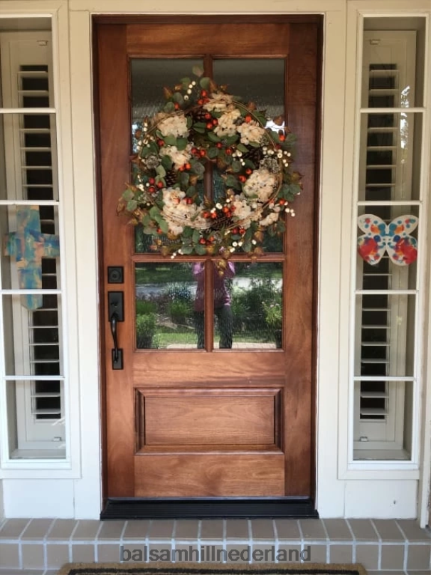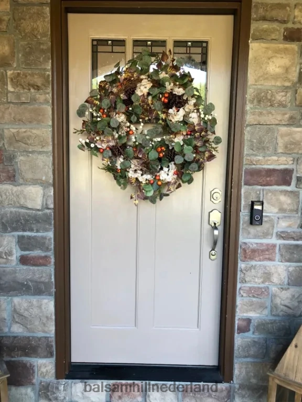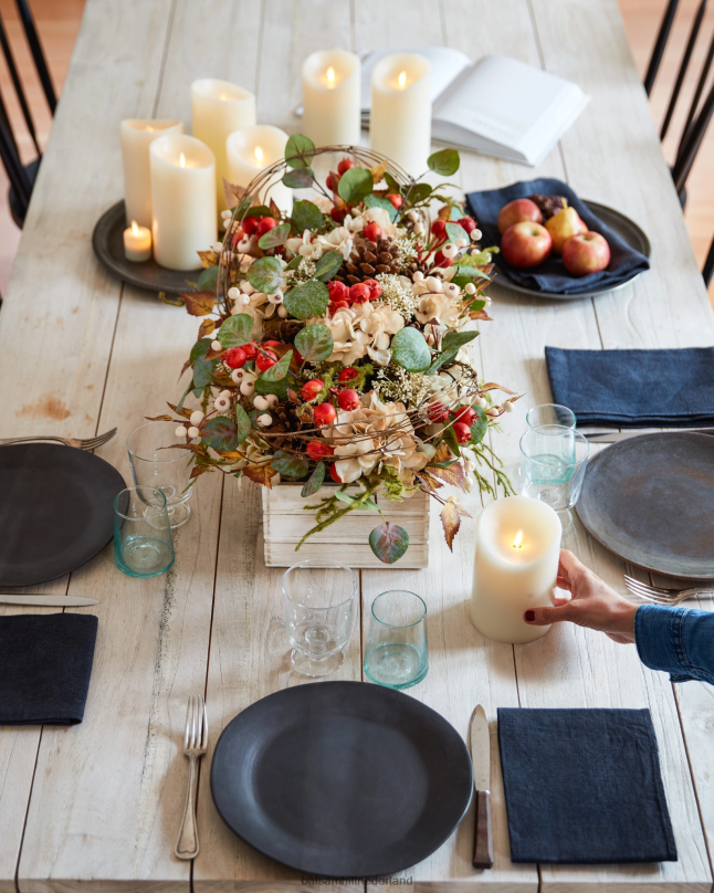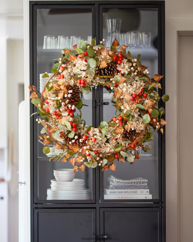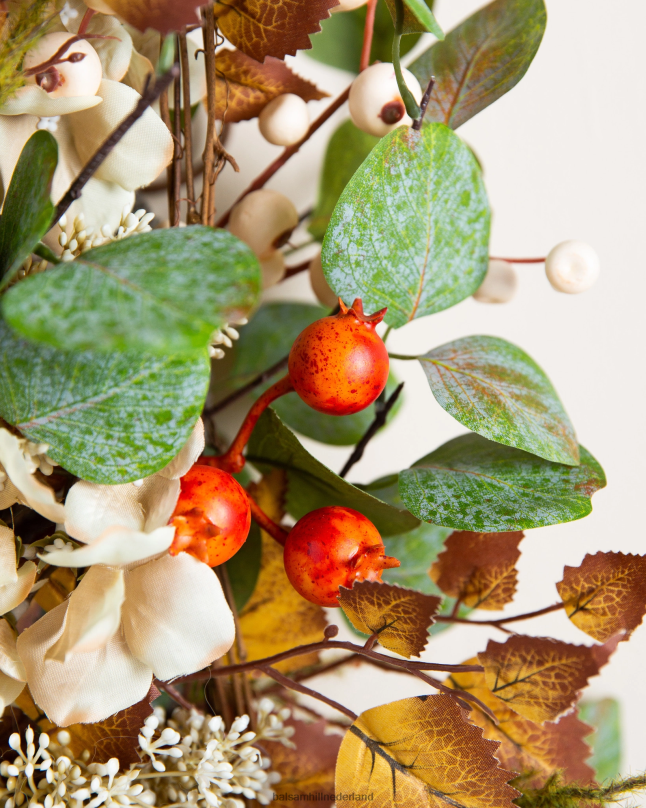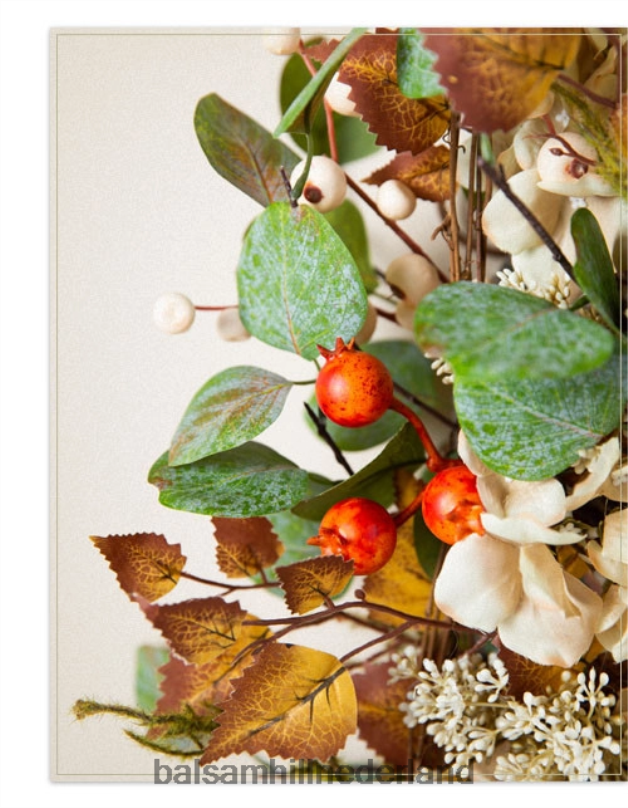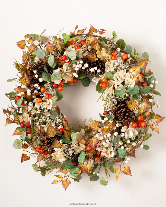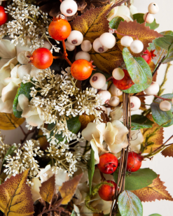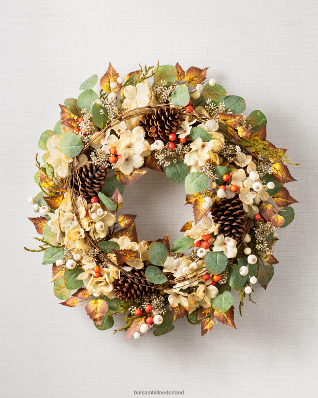 - alle producten in deze collectie bevatten herfstbladeren, hortensia’s, witte bessen, dennenappels en rozen heupen.
