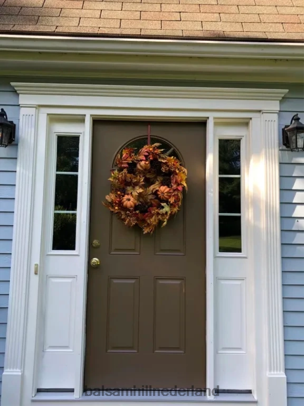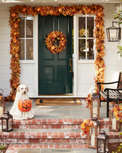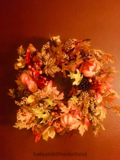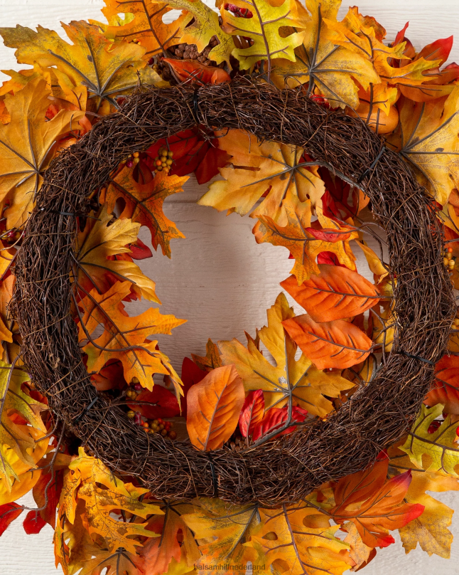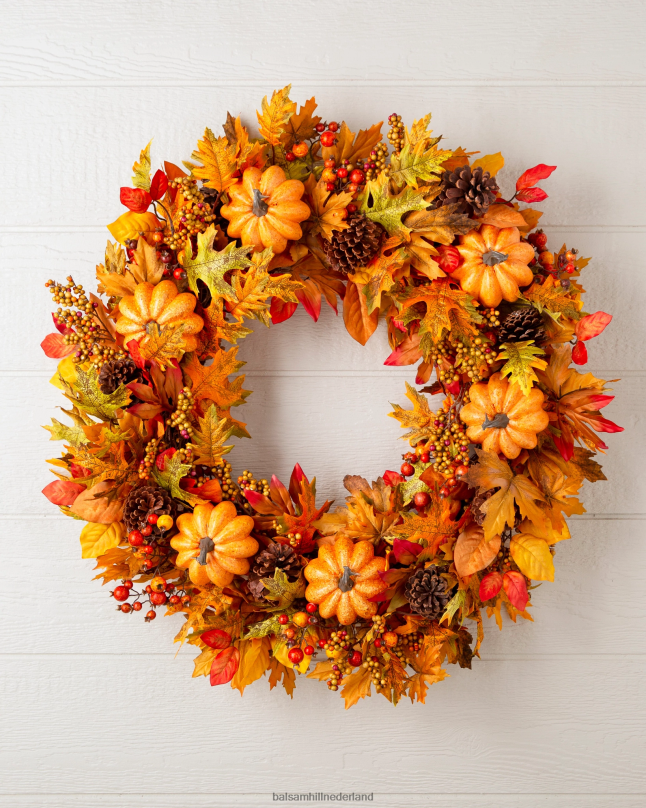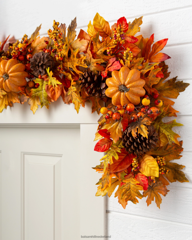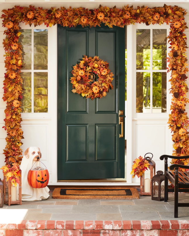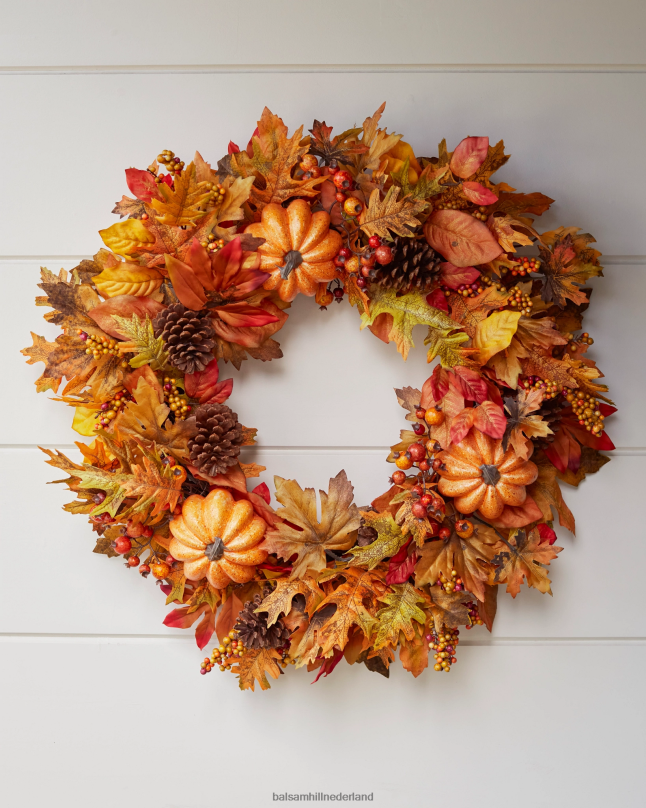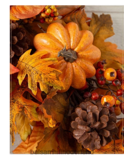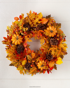 - alle producten in deze collectie bevatten een scala aan pompoenen, dennenappels, sinaasappelbessen, kleine bessentrossen en een mix van marmer-, eiken-, pioen- en magnoliabladeren