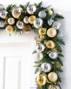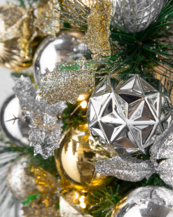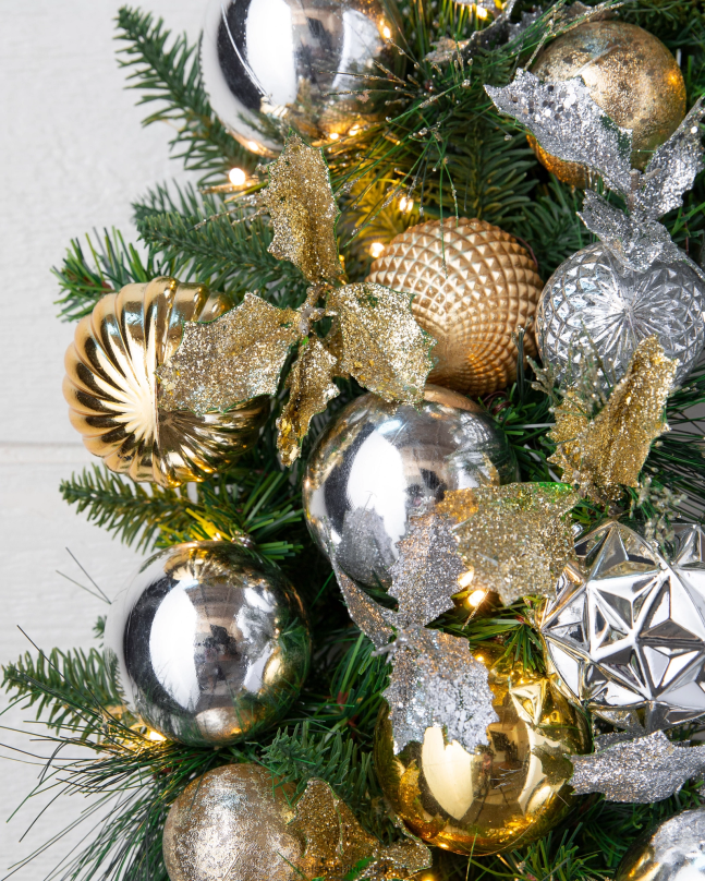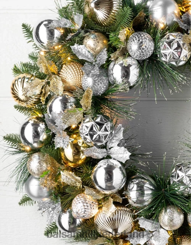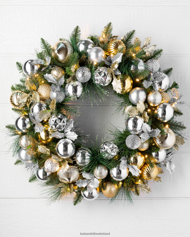 - alle producten in deze collectie zijn voorzien van goudglitterde, lange naalddennenbladeren geaccentueerd met glinsterende hulst, en metalen, onbreekbare ornamenten.