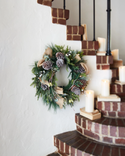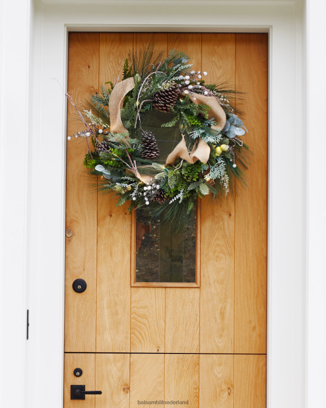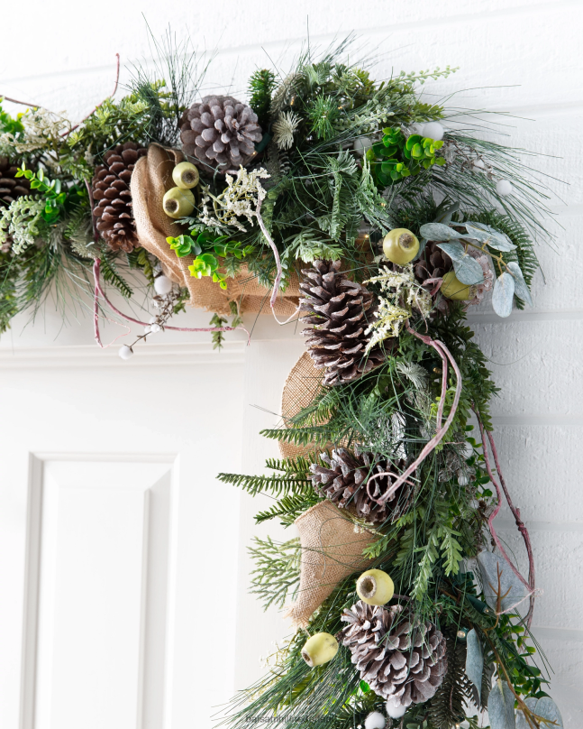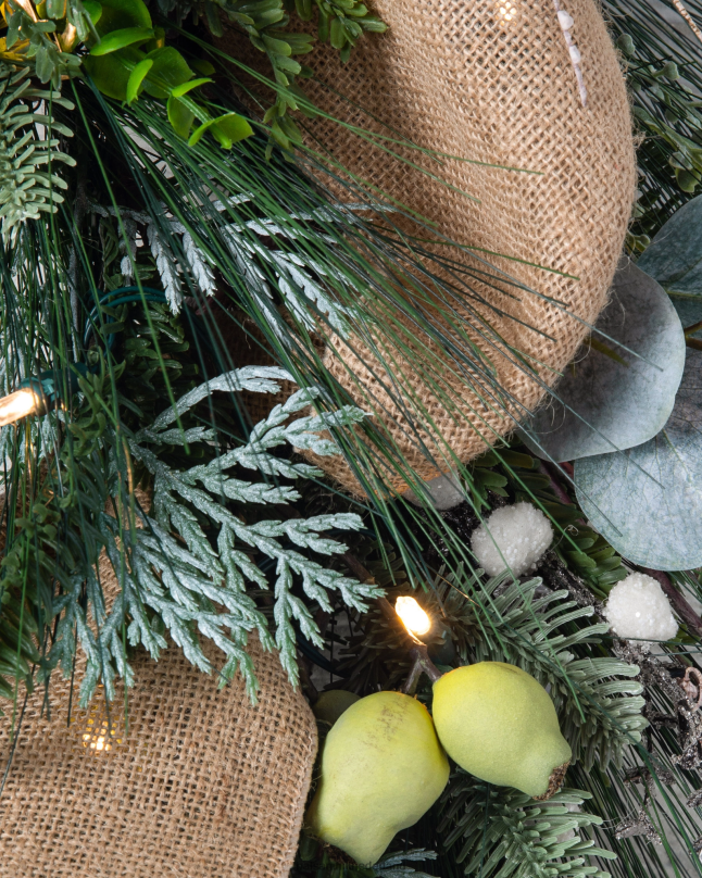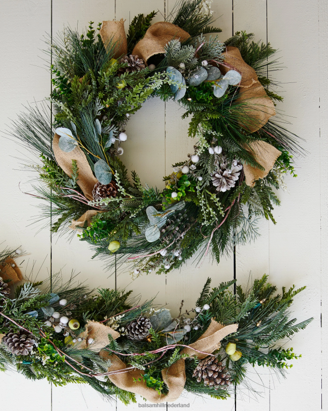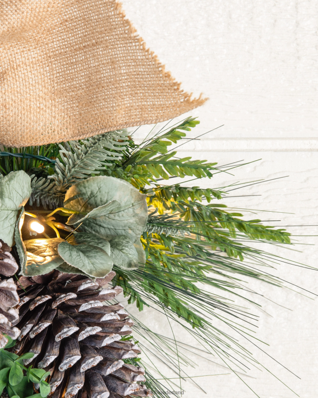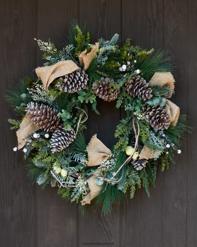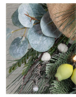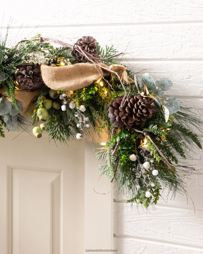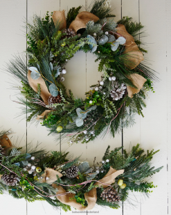 - alle producten in deze collectie zijn voorzien van gemengd blad geaccentueerd met eucalyptusbladeren, katoenstengels, twijgen, natuurlijke dennenappels en jutelint