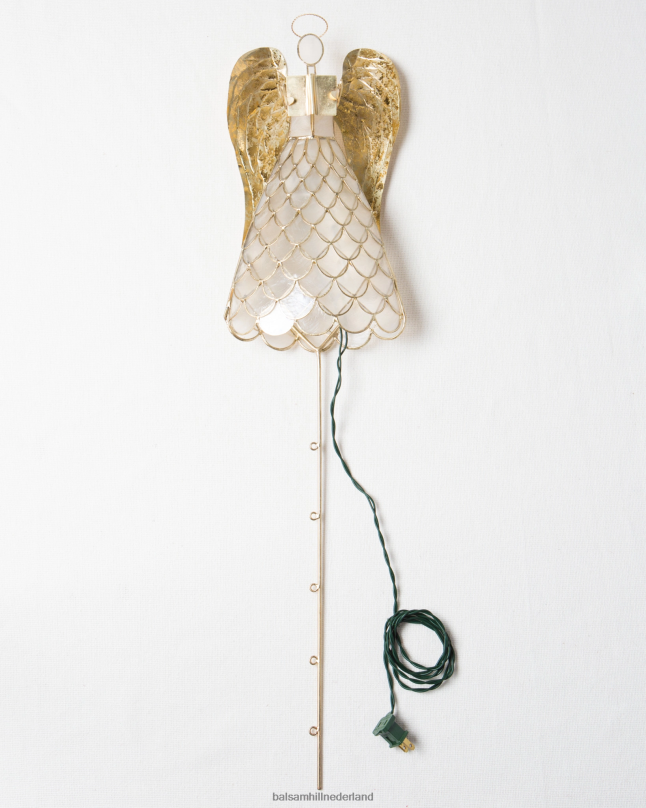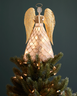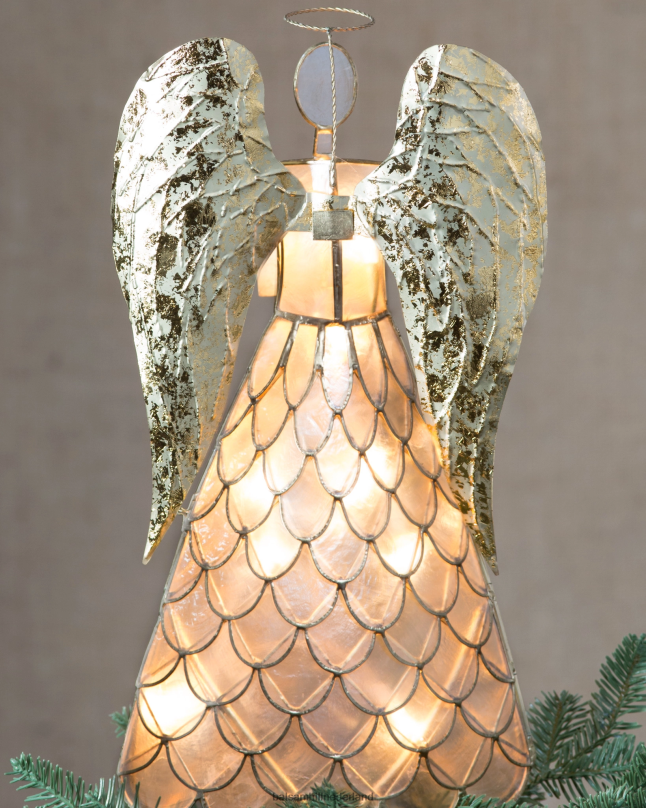 Deze engelenboomtopper is prachtig met de hand gemaakt en is een stralende herinnering aan de vreugde en het wonder van Kerstmis. Gloeilampen werpen een zachte, gouden gloed door iriserende capiz-schelpen, waardoor een gastvrije sfeer ontstaat voor uw vakantievieringen. Dankzij de verwijderbare vleugels zijn deze boomtoppers gemakkelijk op te bergen, terwijl een afneembare paalstandaard ervoor zorgt dat onze kleinere engel kan worden omgebouwd tot een prachtige lamp of nachtlampje.