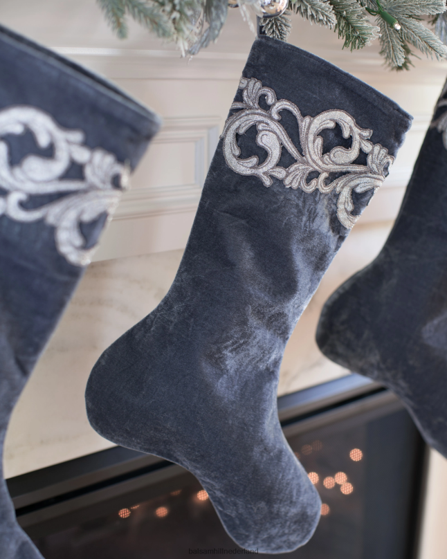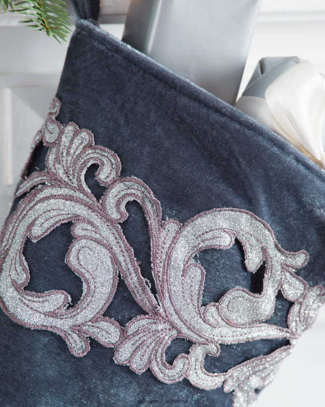 De zachte azuurblauwe tint van onze fluwelen kous geeft je schoorsteenmantel een verfijnde kleuraccent. De rijke fluwelen stof is versierd met glinsterende acanthusbloemen, waardoor kersttraktaties en snuisterijen een feestelijk en toch elegant interieur krijgen. combineer deze kous met onze Fransblauwe fluwelen boomrok voor een prachtige weergave in een niet-traditioneel palet.