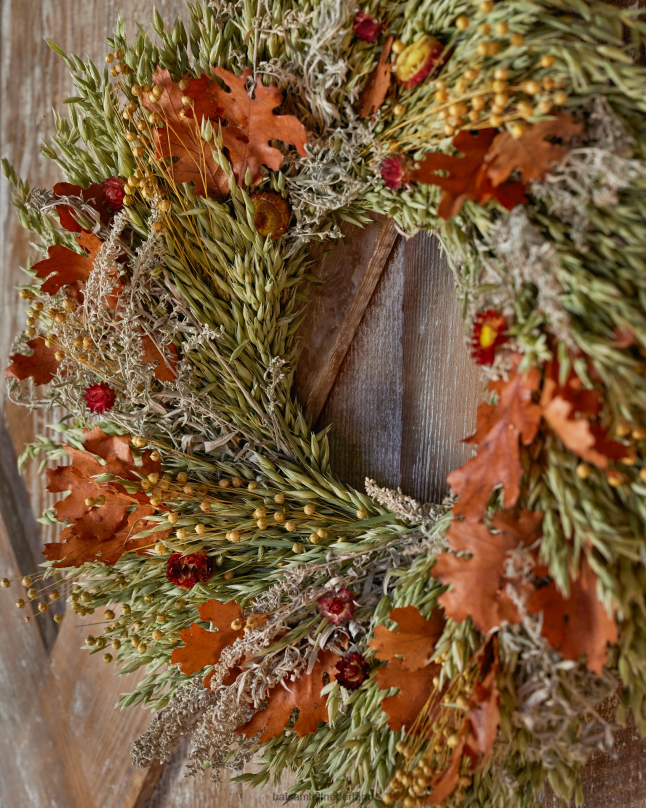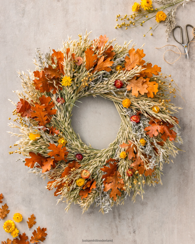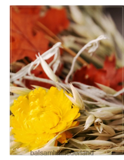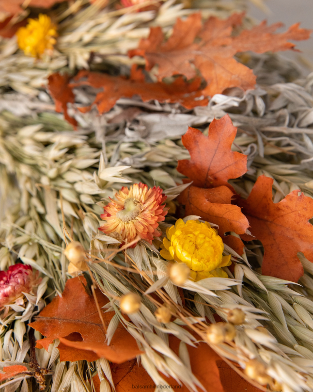 - alle producten in deze collectie bevat gedroogde strobloemen, gele eikenbladeren, avena-haver, artemisia en vlas.