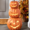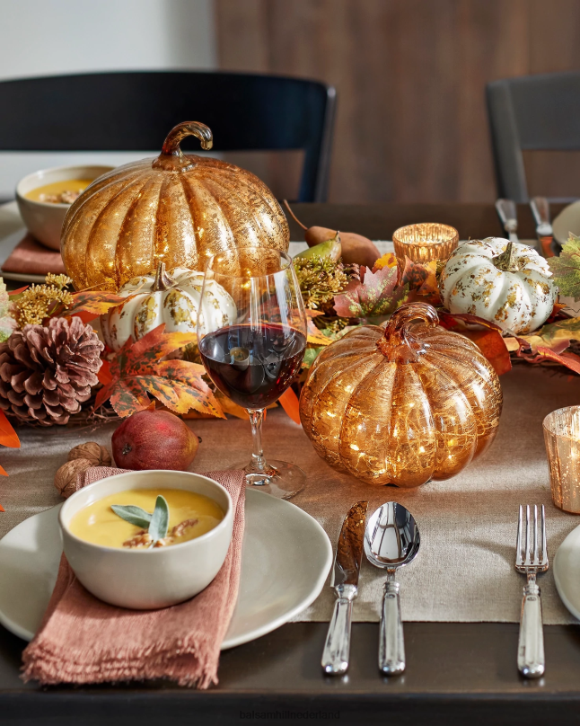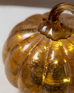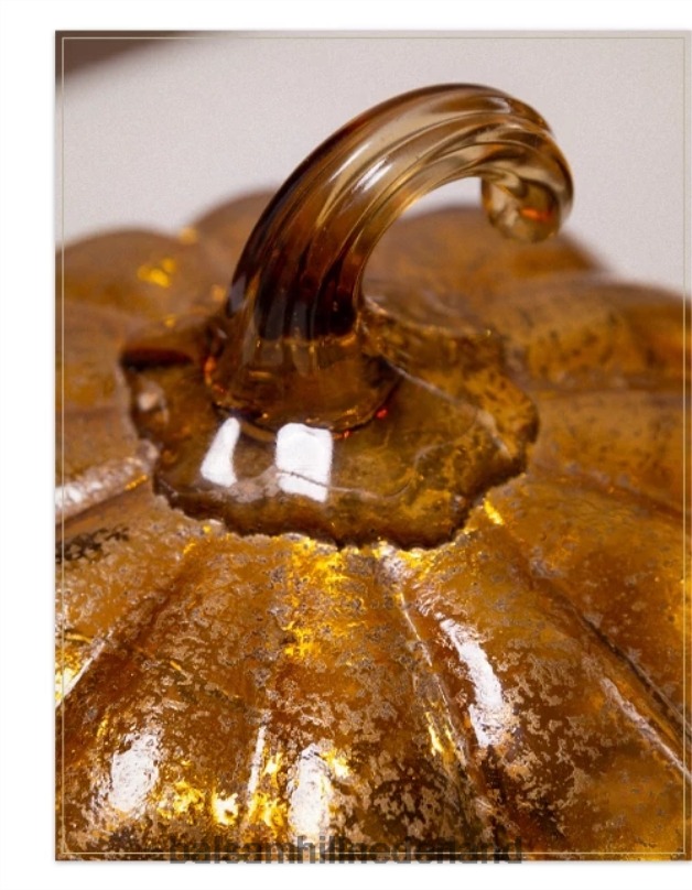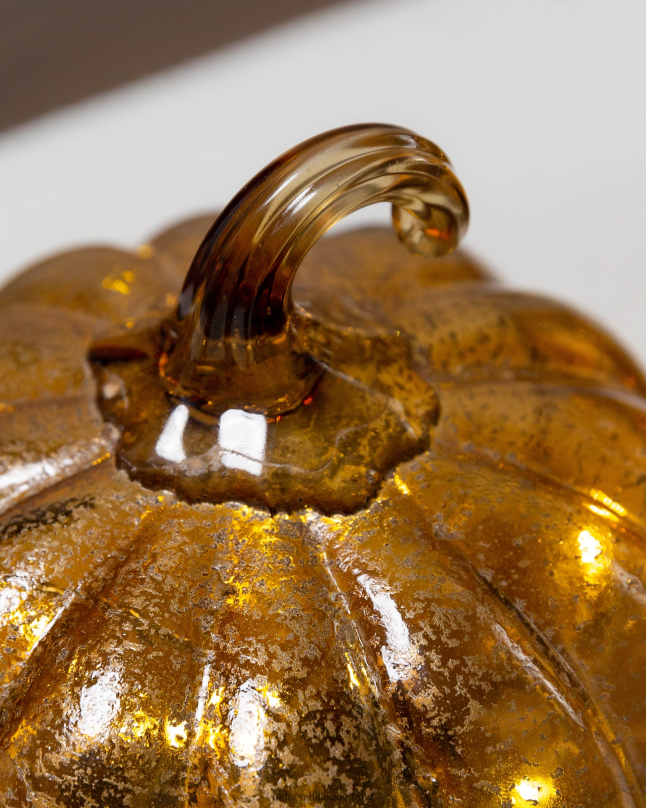 geef je herfstdecor een heldere, moderne uitstraling met elegante glasaccenten. een amberkleurige folie-afwerking laat deze pompoenen overdag glinsteren, terwijl kerstverlichting ‘s nachts sierlijk glinstert.