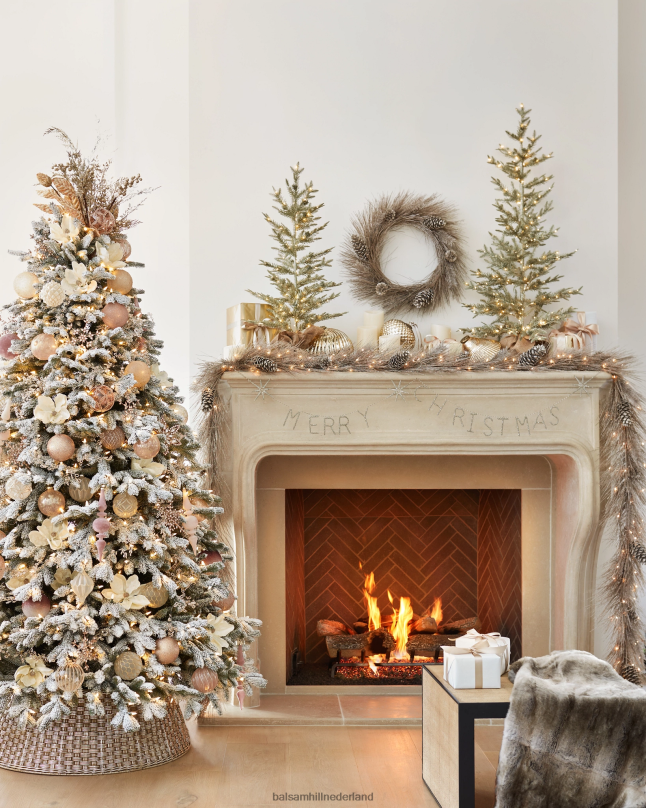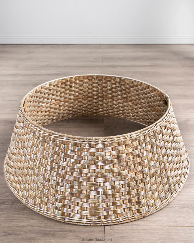 traditioneel materiaal ontmoet hedendaagse stijl voor een geïnspireerde nieuwe look. til je kerstversiering naar een hoger niveau met deze geweven boomkraag, gemaakt van geweven all-weather vlechtwerk met een verouderde zilverachtige afwerking.