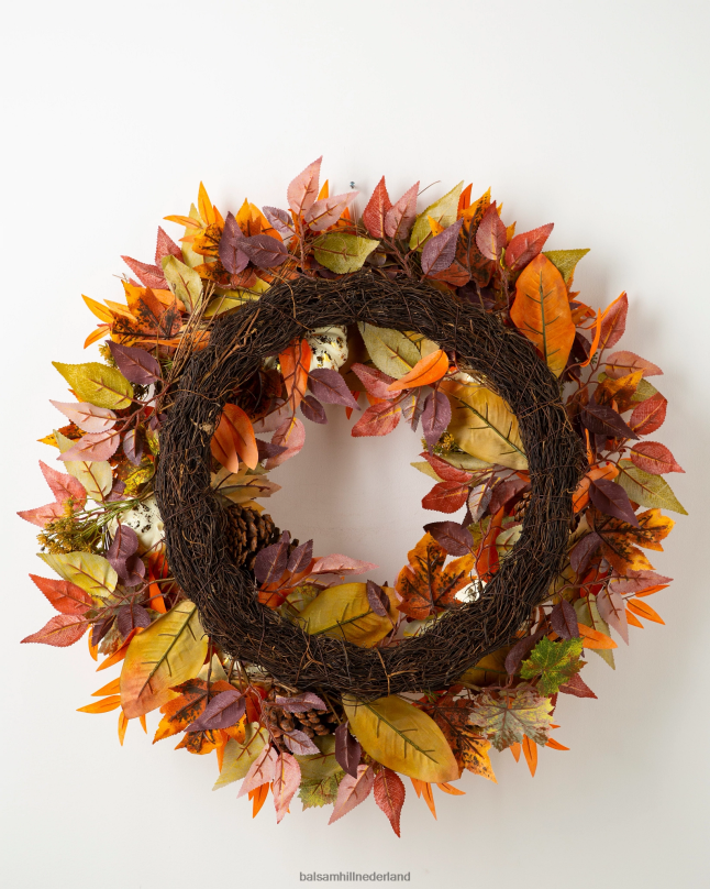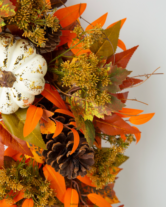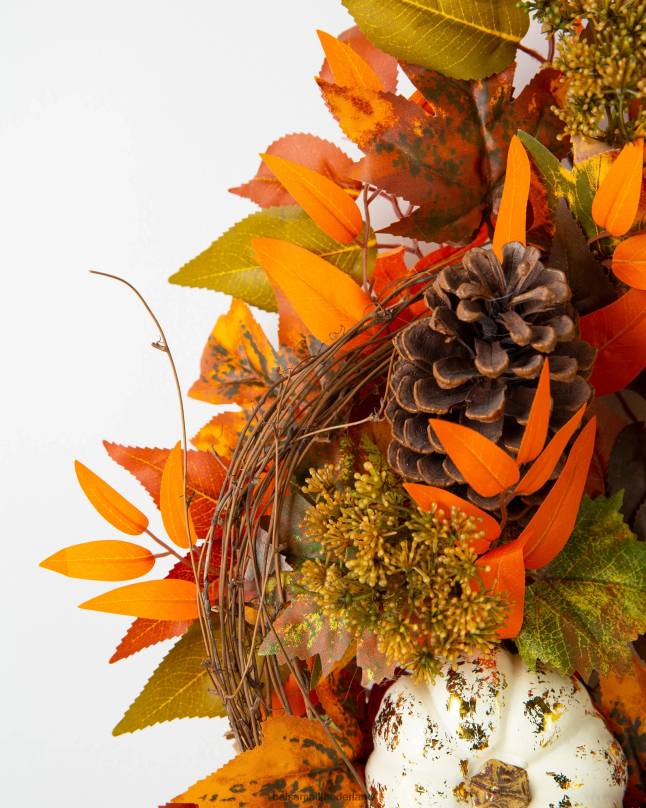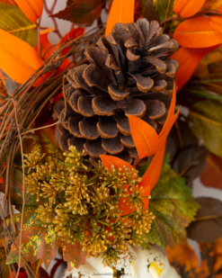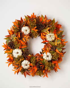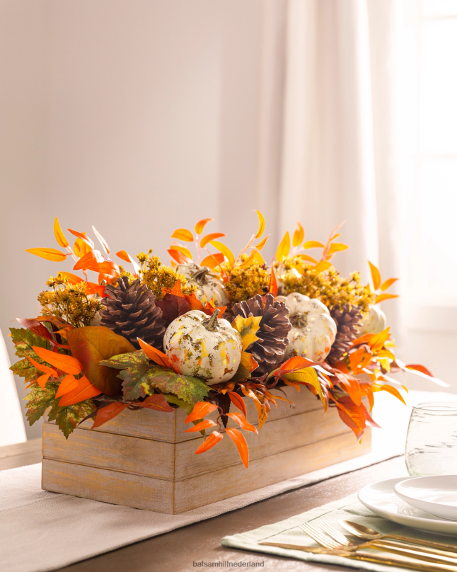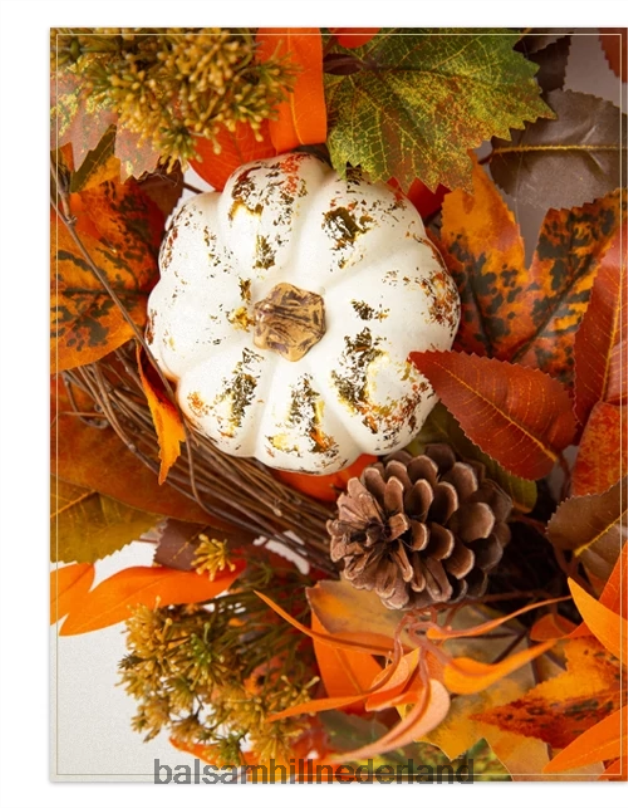 - alle producten in deze collectie bestaan uit beuken-, esdoorn-, berken- en essenbladeren, geaccentueerd met wit vergulde pompoenen en natuurlijke dennenappels.