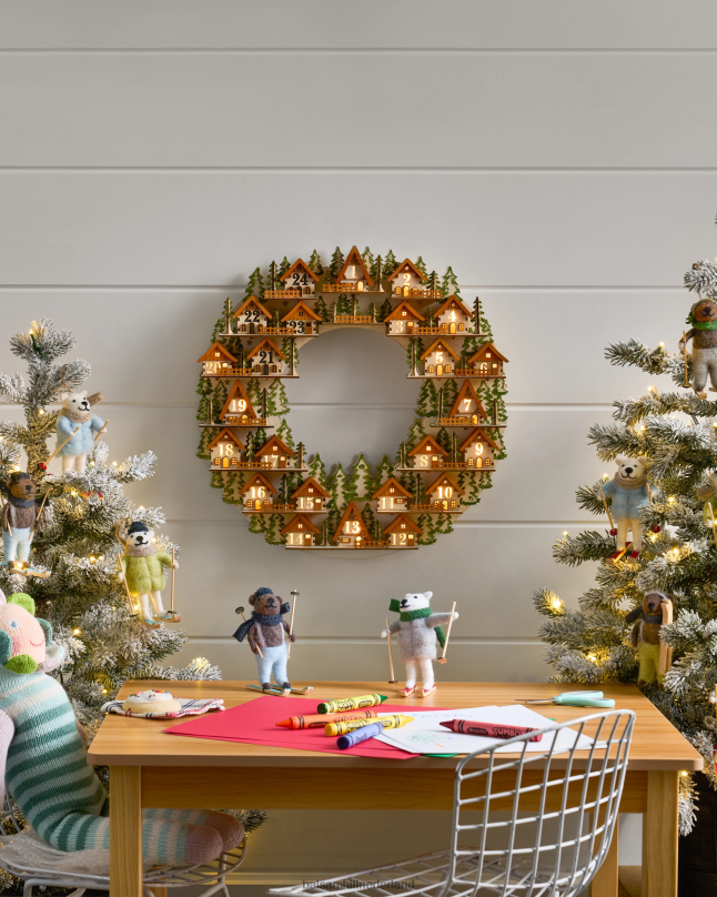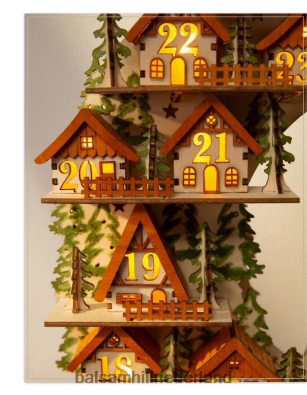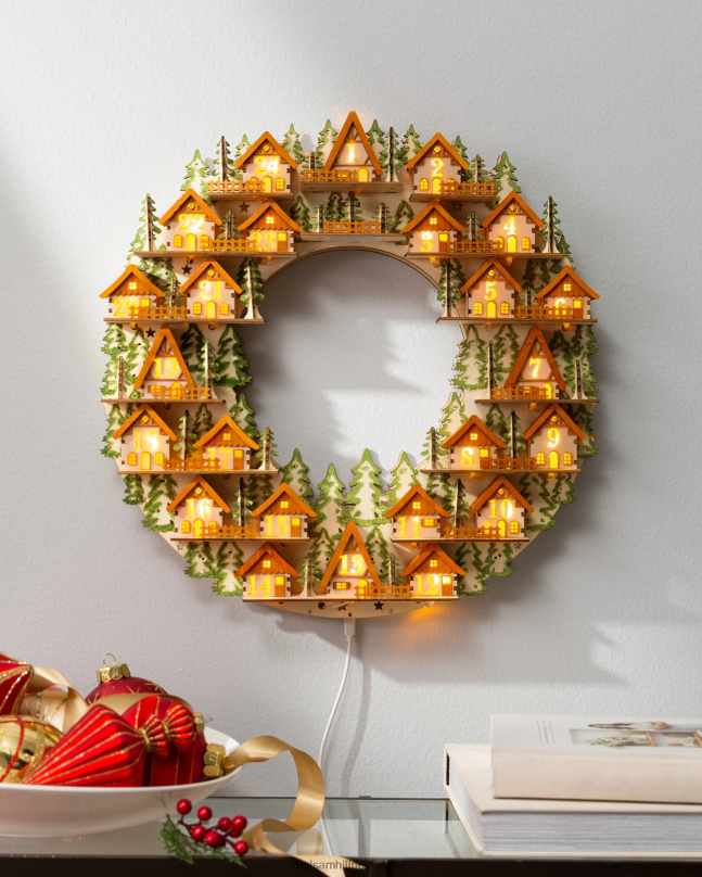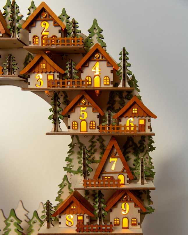Laat het aftellen naar Kerstmis beginnen met deze unieke, vintage-geïnspireerde krans. verras uw dierbaren door elke dag een mini-huis te verlichten dichter bij het grote feest.