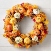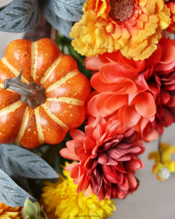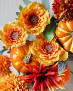 - Alle producten in deze collectie bevatten dahlia’s en moeders in verschillende tinten oranje, neppompoenen, en groene bladeren.