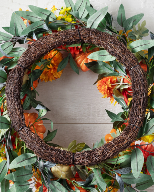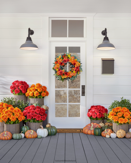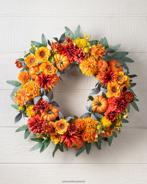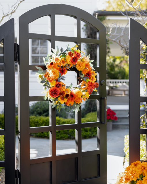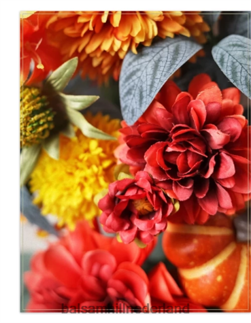 - Alle producten in deze collectie bevatten dahlia’s en moeders in verschillende tinten oranje, neppompoenen, en groene bladeren.