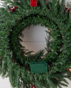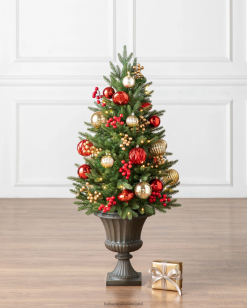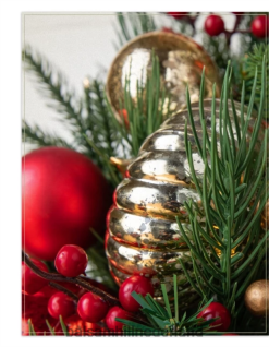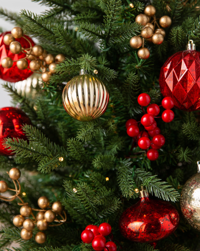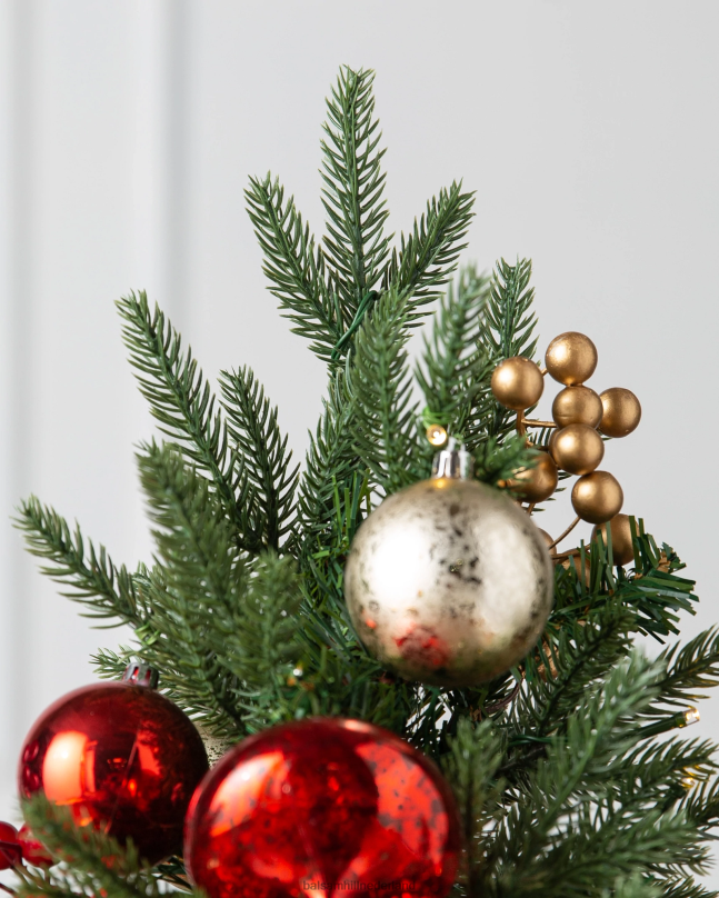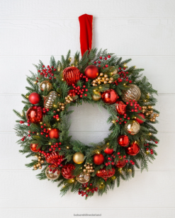 - Alle producten in deze collectie zijn voorzien van namaakcipresgebladerte versierd met breukbestendige ornamenten, rode bessen, en natuurlijke dennenappels