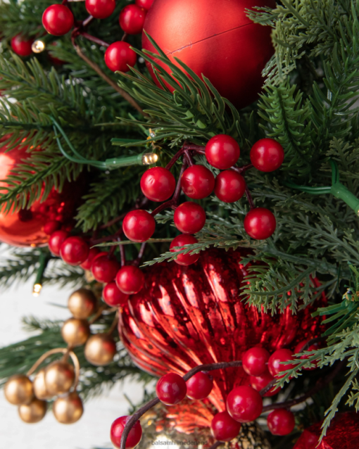 - Alle producten in deze collectie zijn voorzien van namaakcipresgebladerte versierd met breukbestendige ornamenten, rode bessen, en natuurlijke dennenappels
