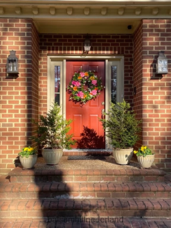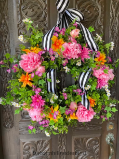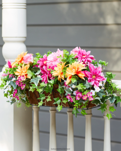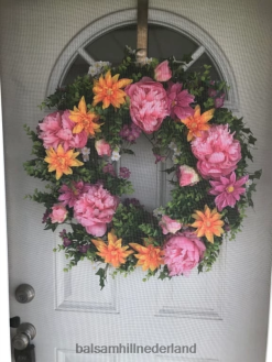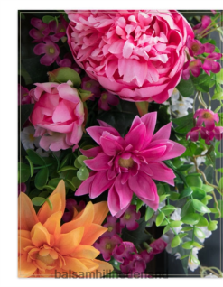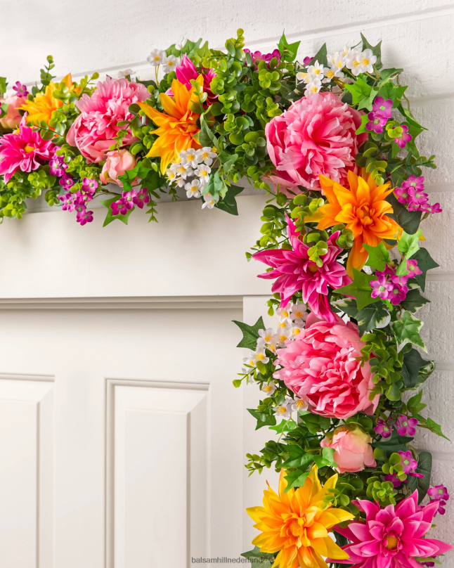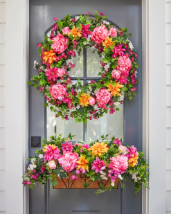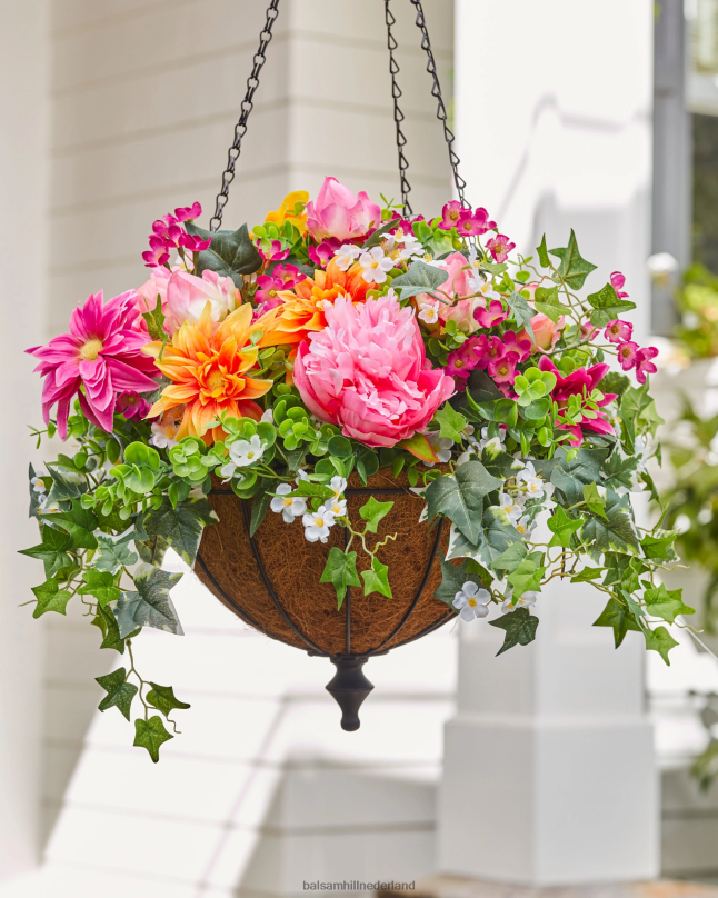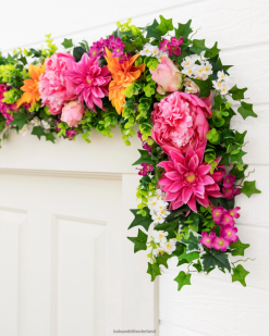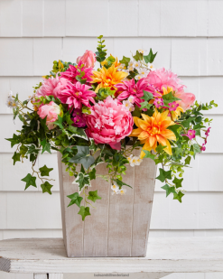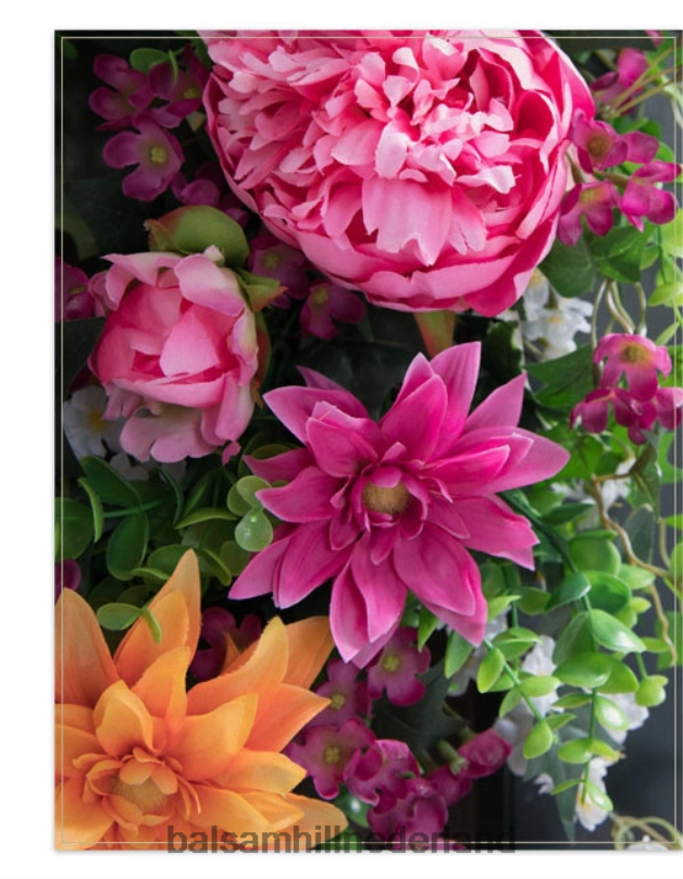 - alle producten in deze collectie bevatten een scala aan kunstbloemen, waaronder pioenrozen, madeliefjes, dahlia’s, chrysanten, lavendel, klimop en levensechte buxusbladeren.