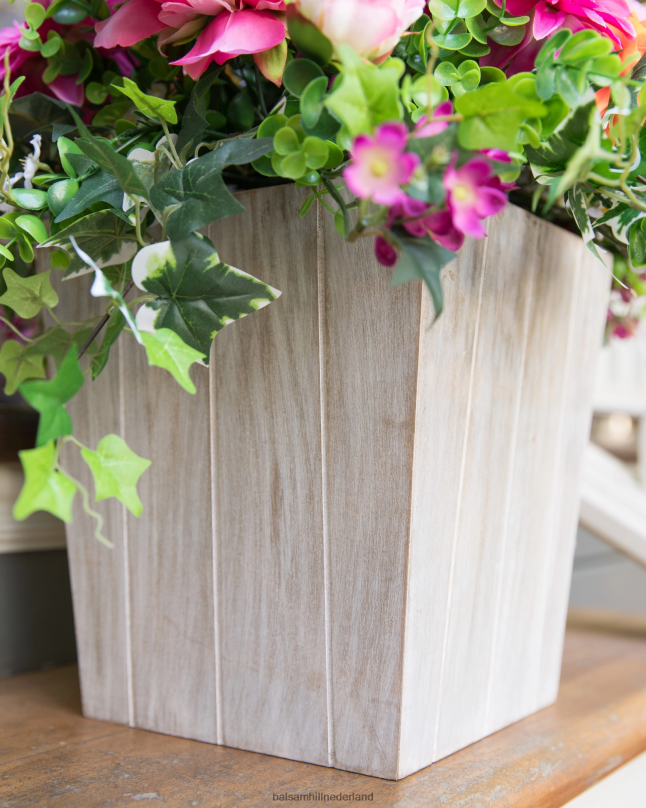 - set in een houten vat met een grijze wassing van 30 cm lang x 30 cm breed x 35,5 cm hoog