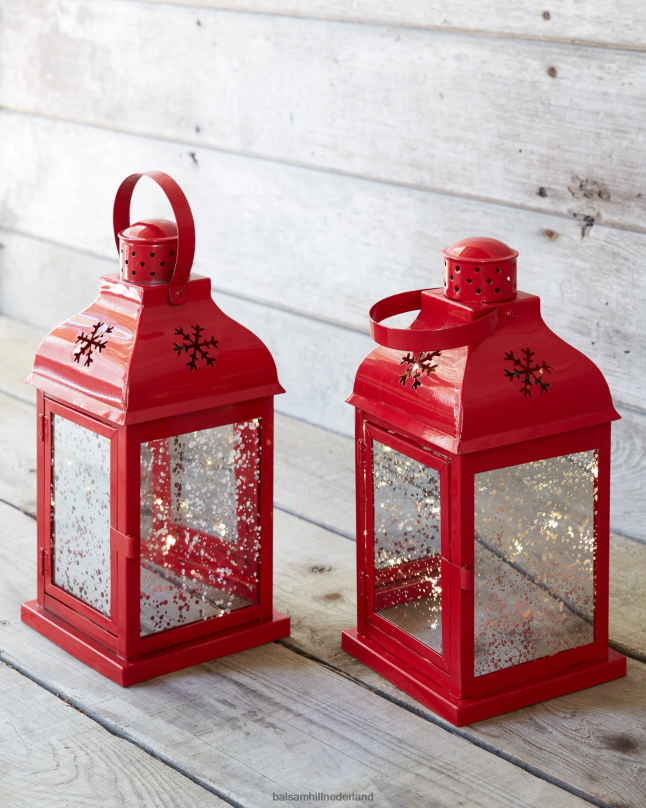 Verlicht deze feestdagen uw paden of entrees met onze prachtige kerstlantaarns. een stevig metalen frame in een feestelijke rode tint is gesneden in een sneeuwvlokontwerp, terwijl de warme gloed van een led-licht door gespikkeld glas straalt.
