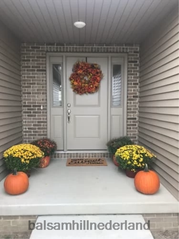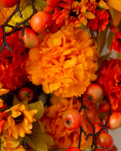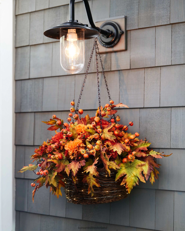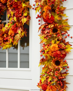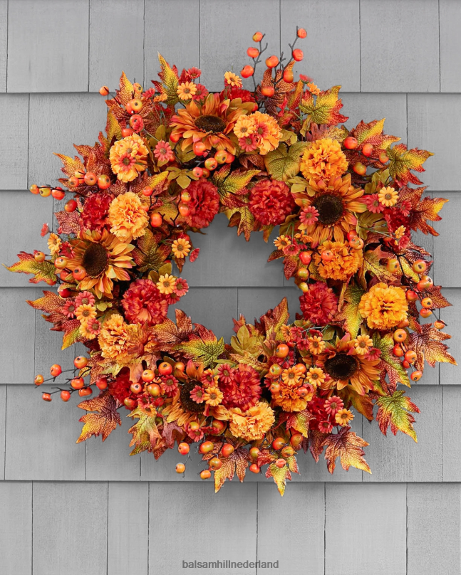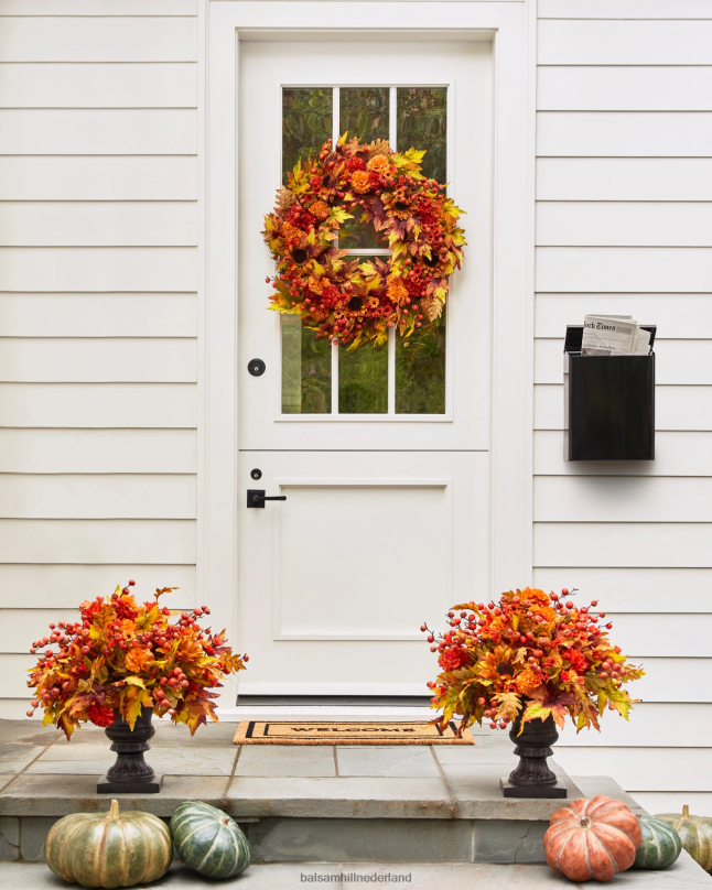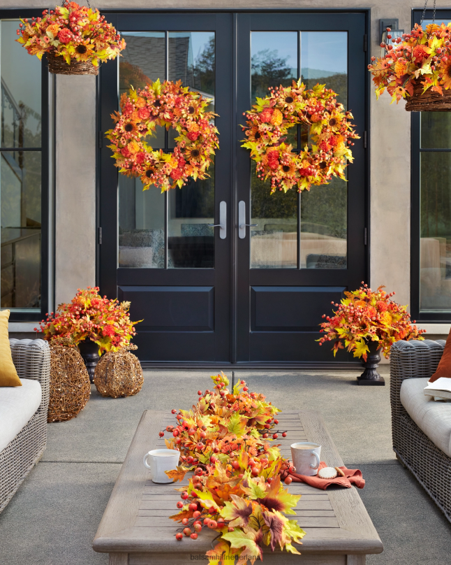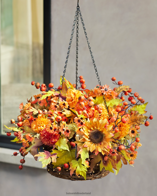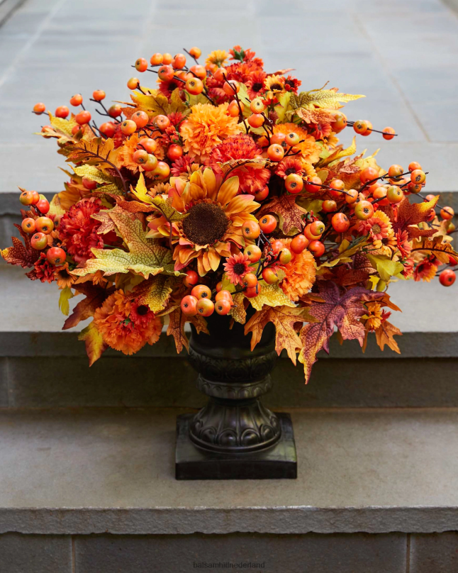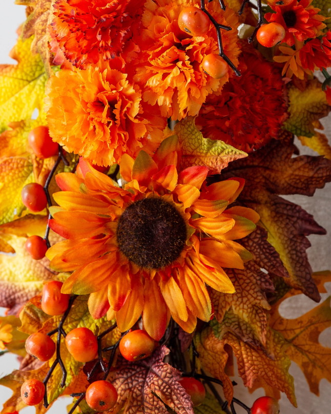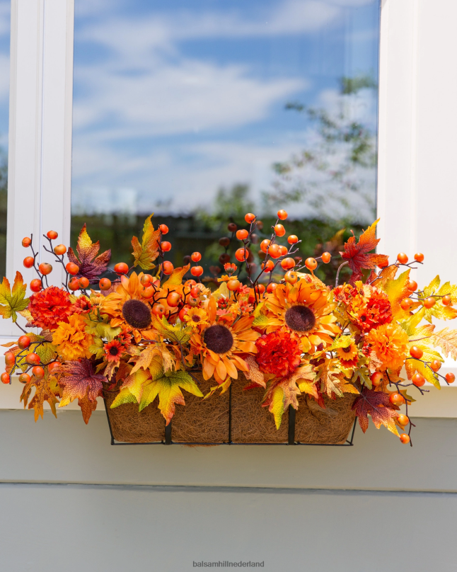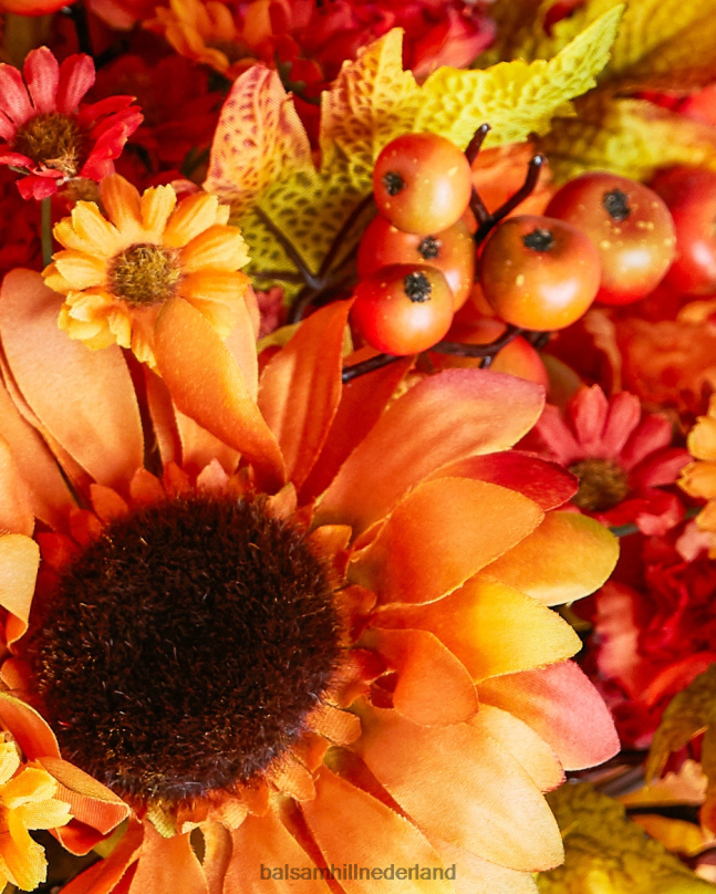 Verlevendig herfstdecoraties met een kleurrijke mix van zonnebloemen, herfstbladeren en moeders. deze buitencollectie is uv-beschermd om zijn schoonheid en schittering te behouden, en zorgt voor een prachtig geheel als je hem samen op de veranda of op het terras plaatst.