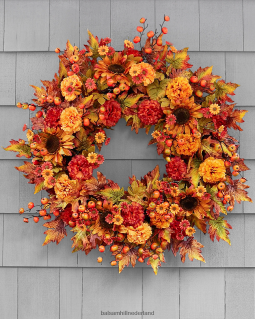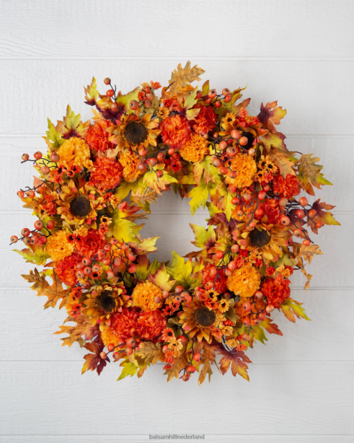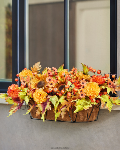 Verlevendig herfstdecoraties met een kleurrijke mix van zonnebloemen, herfstbladeren en moeders. deze buitencollectie is uv-beschermd om zijn schoonheid en schittering te behouden, en zorgt voor een prachtig geheel als je hem samen op de veranda of op het terras plaatst.