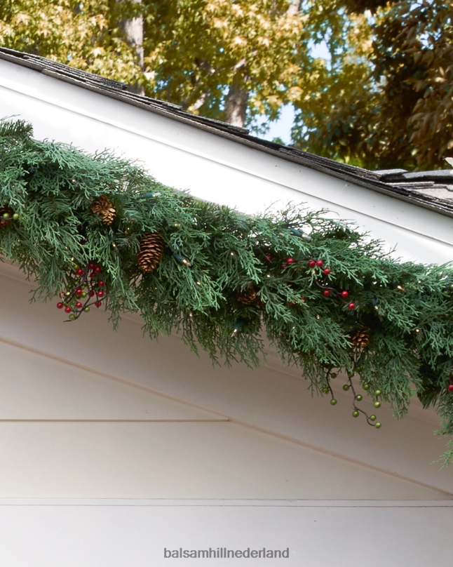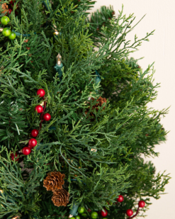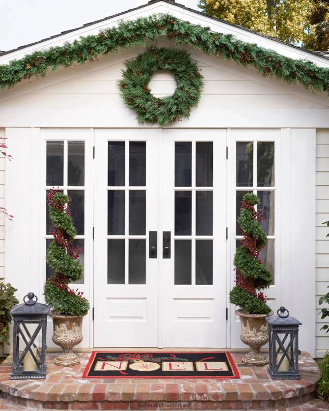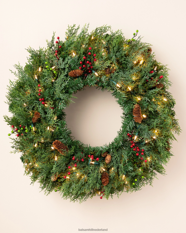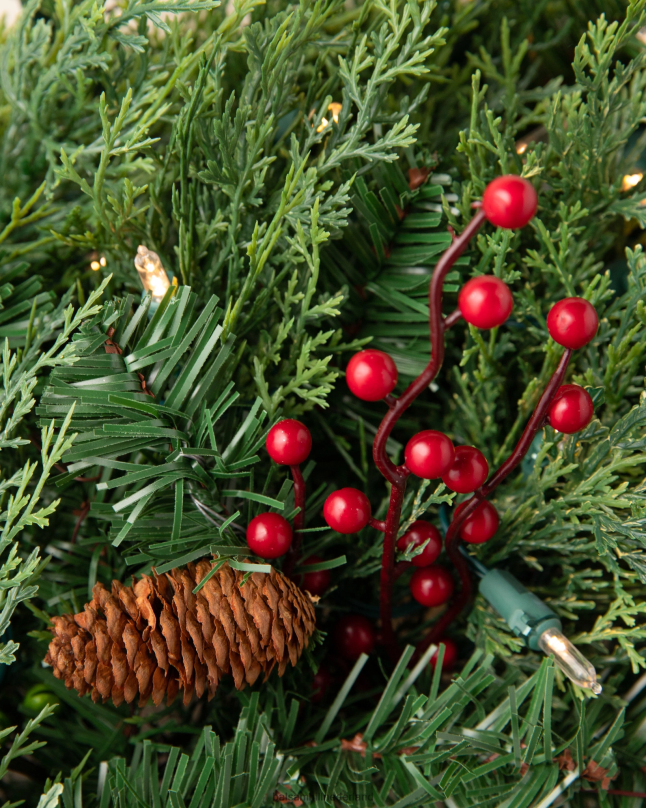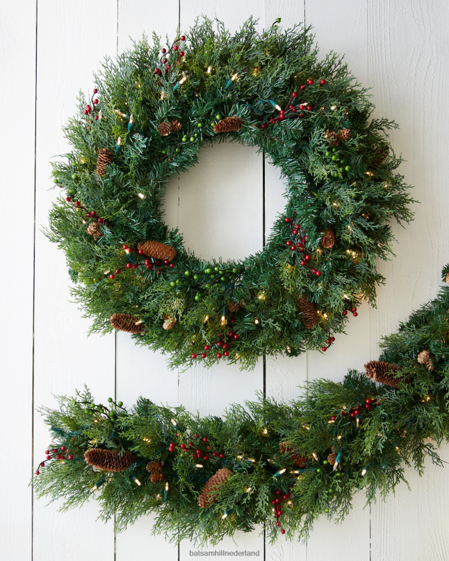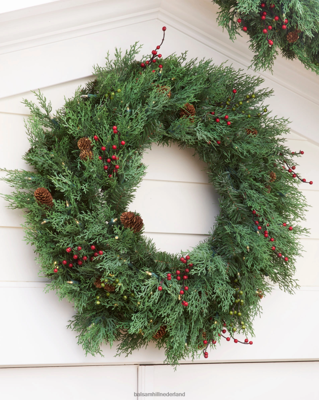 Begroet vakantiebezoekers en geliefden met de verfrissende aanblik van cipressengroen. weelderig blad geaccentueerd met gemengde bessen en natuurlijke dennenappels voegen direct charme toe aan elke ruimte.