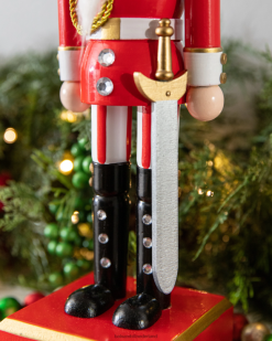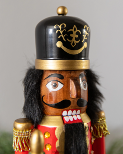 - met een notenkrakerfiguur in een gestreepte geklede broek
