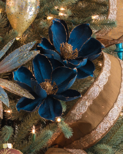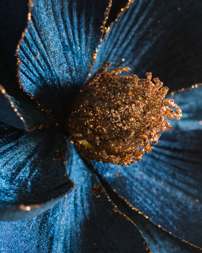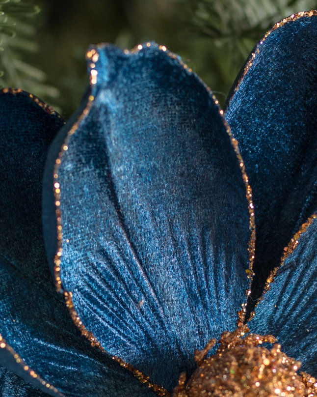 - met marineblauwe magnolia’s geaccentueerd met koperkleurige glitters