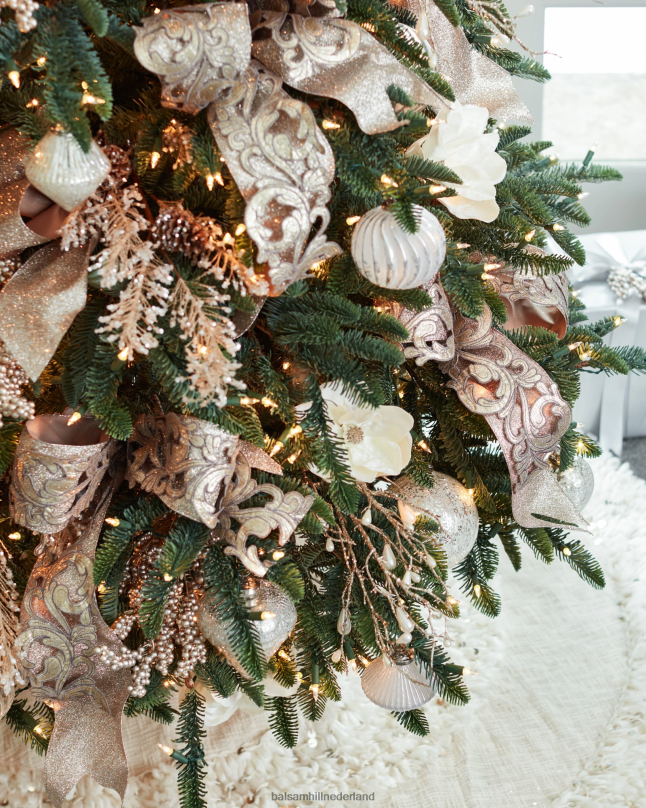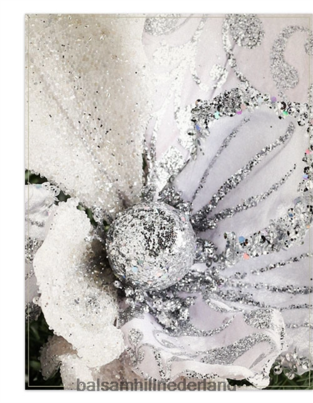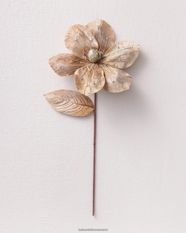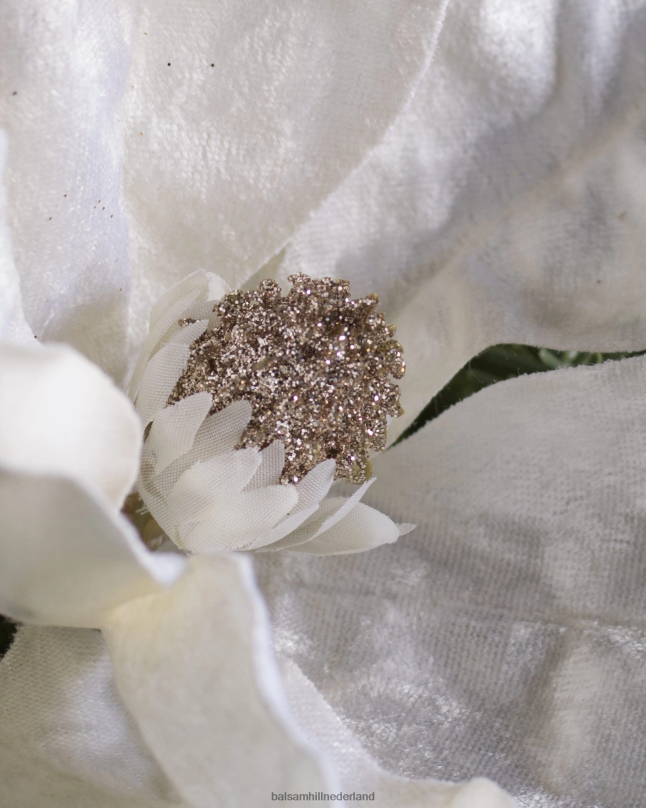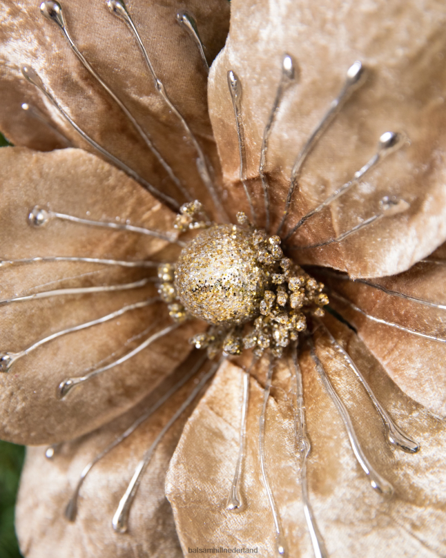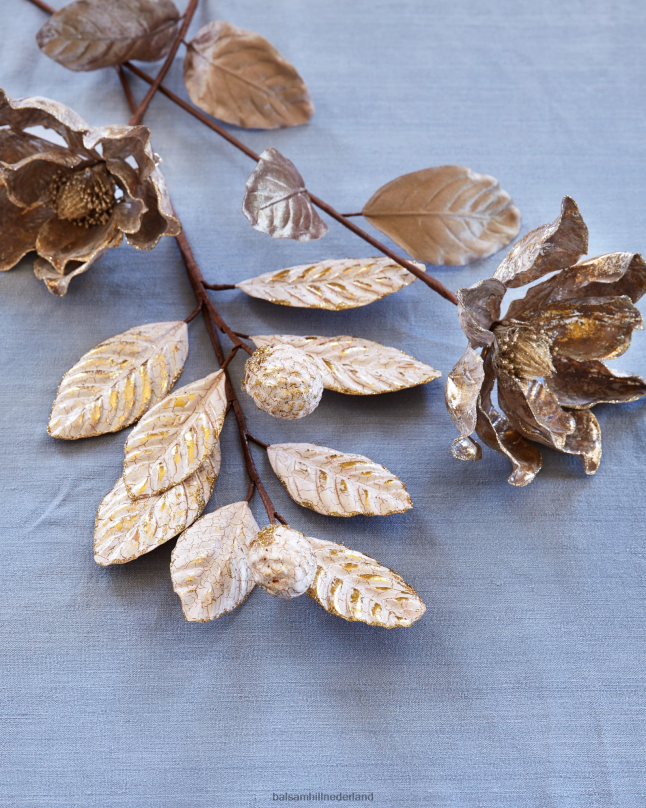 - met ivoren magnolia’s verfraaid met bronzen glitters