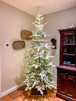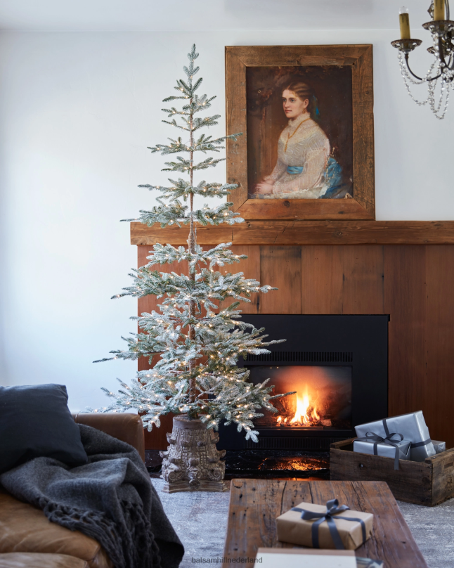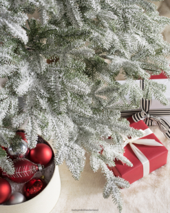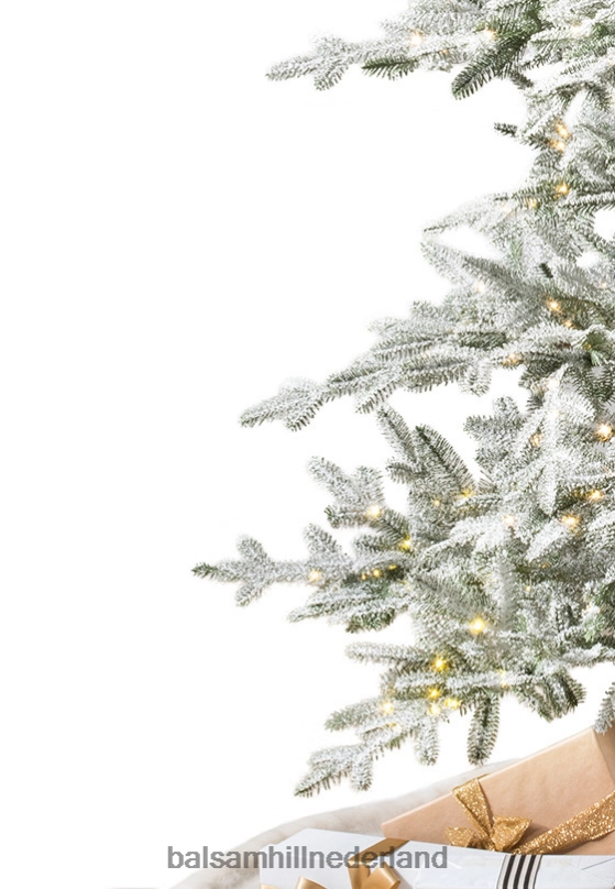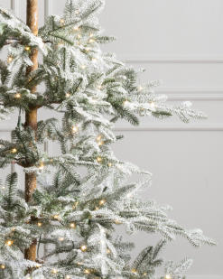 deze kunstmatige kerst boom heeft een organisch silhouet en een zichtbare nepstam voor een meer natuurlijke uitstraling. het lichtgroene, echte naaldblad is zwaar bevroren om het uiterlijk van prachtige met sneeuw bedekte takken na te bootsen.