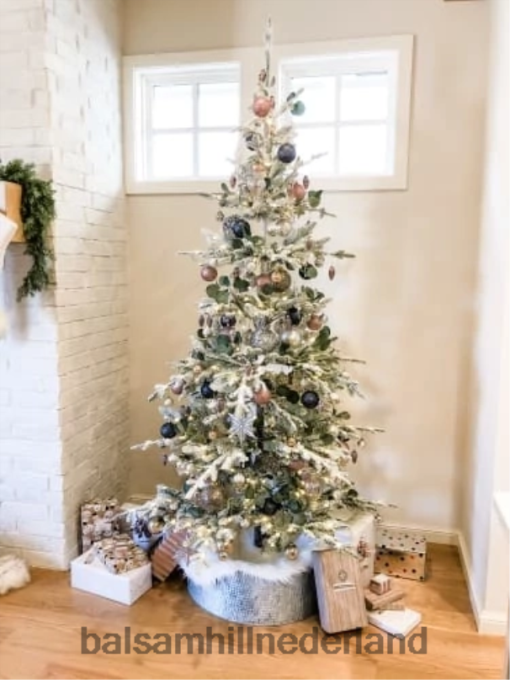 deze kunstmatige kerst boom heeft een organisch silhouet en een zichtbare nepstam voor een meer natuurlijke uitstraling. het lichtgroene, echte naaldblad is zwaar bevroren om het uiterlijk van prachtige met sneeuw bedekte takken na te bootsen.