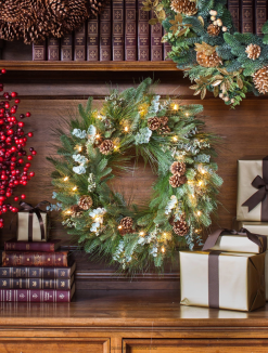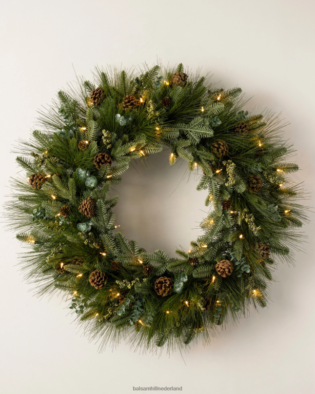- alle producten in deze collectie bevatten een realistische mix van premium bh-balsemspar en bh fraser spar tips, vervaardigd met echte naald bladeren versierd met bestrooide dennenappels, zilverachtige eucalyptusbladeren en bessen.