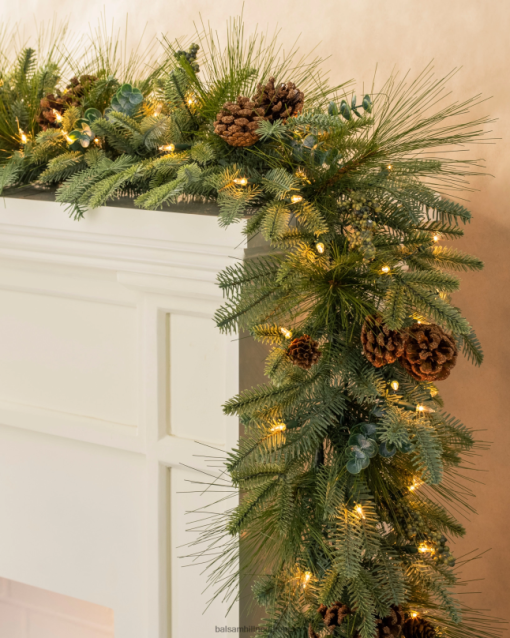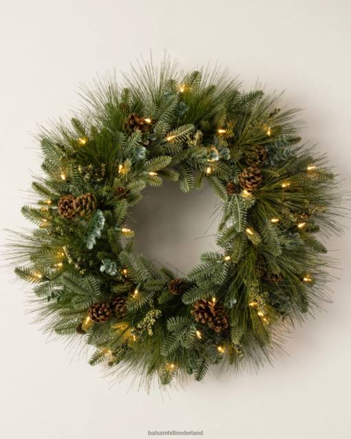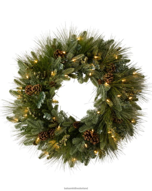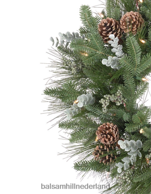 - alle producten in deze collectie bevatten een realistische mix van premium bh-balsemspar en bh fraser spar tips, vervaardigd met echte naald bladeren versierd met bestrooide dennenappels, zilverachtige eucalyptusbladeren en bessen.