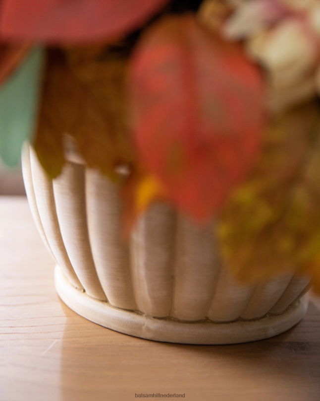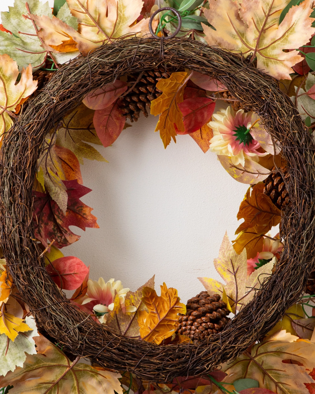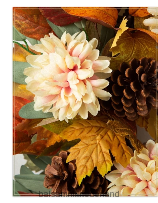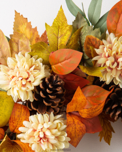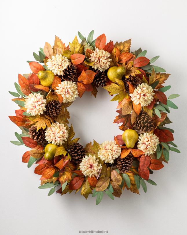 - alle producten in deze collectie zijn voorzien van namaakperen, dennenappels, ivoren dahlia’s, eik, esdoorn, beuken- en eucalyptusbladeren