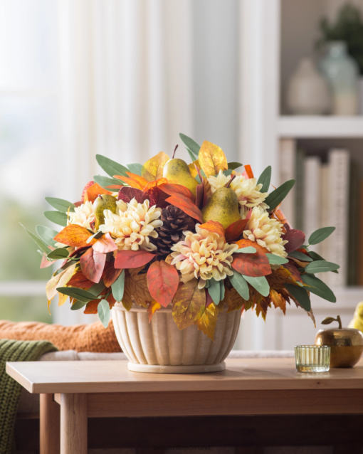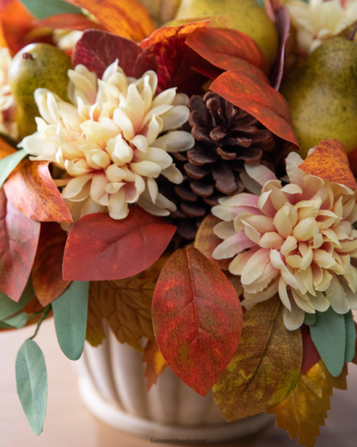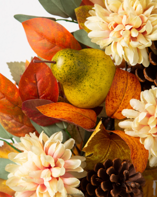 - alle producten in deze collectie zijn voorzien van namaakperen, dennenappels, ivoren dahlia’s, eik, esdoorn, beuken- en eucalyptusbladeren